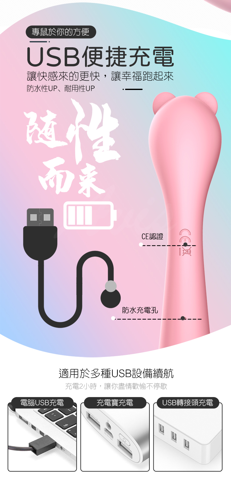 鼠於你的性福時光棒身柔軟彈性,隨性彎曲貼合女性生理點不拉傷私處,能有效刺激G點喔~採用USB充電隨處隨充,隨遇而安讓快感來的更快。8種高潮震顫深層穿透,頭不震動尾部插入,外不滿足蜜豆,內部衝擊G點蜜道。且靜音防水給您一個安穩的空間,盡情享受高潮